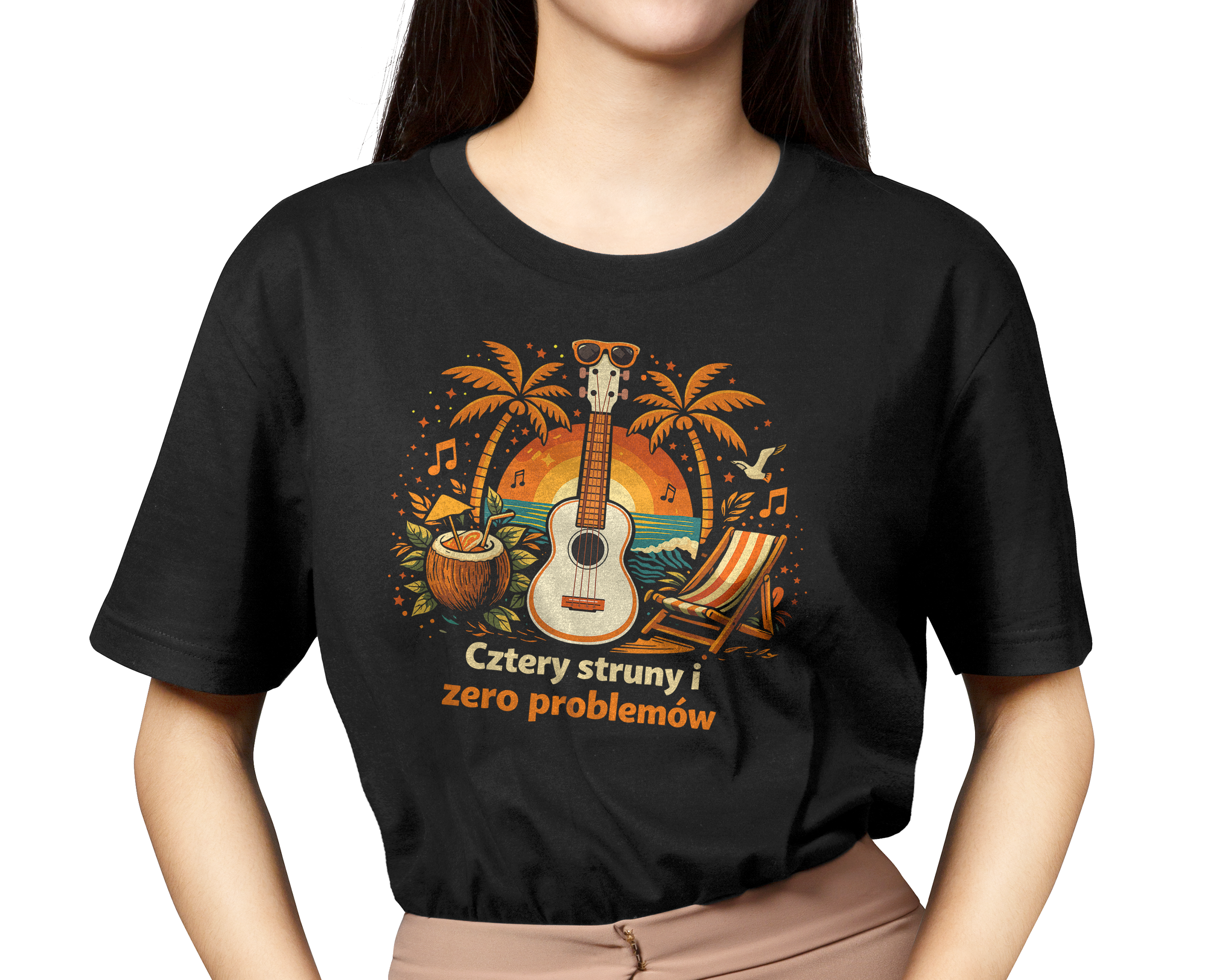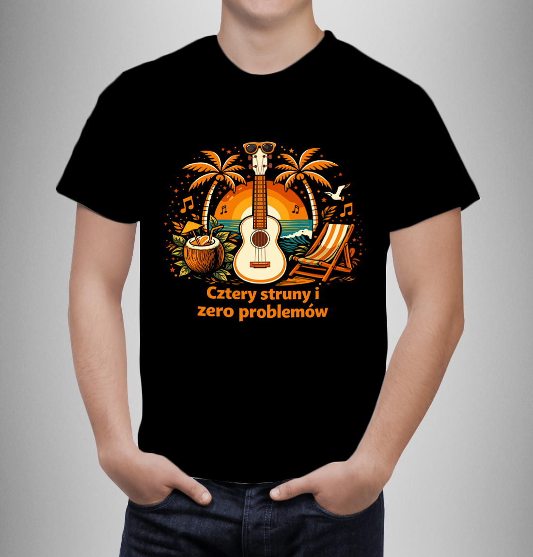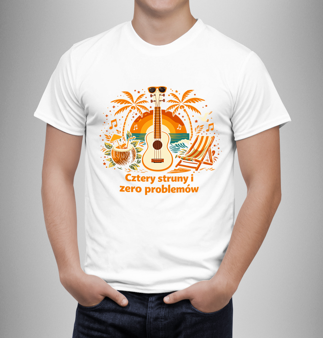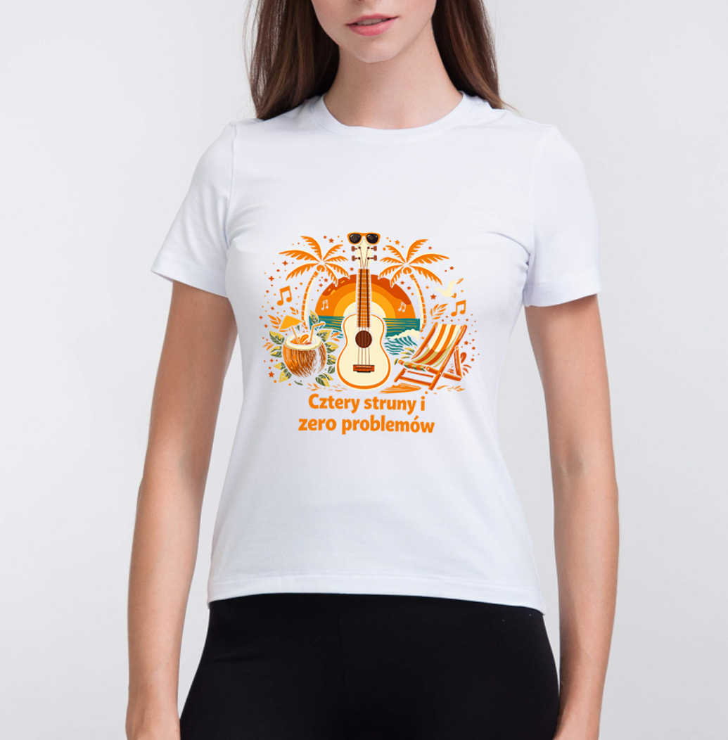 Koszulka „Cztery struny i zero problemów” – Poczuj Hawajski Luz!